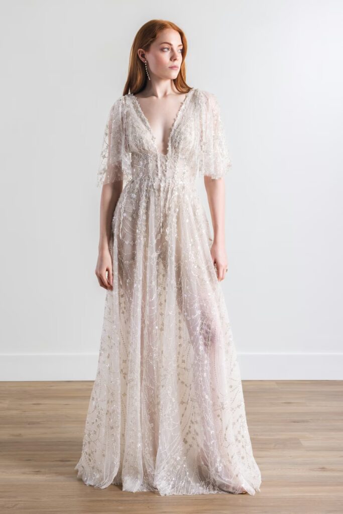 The Storm dress from Watters Designs is what I would imagine a fae queen might wear on her wedding day. Here is how they describe it: “Created from a blend of Galaxy Rhinestone Tulle, Illusion Tulle, and Haze Net, this gown is a symphony of ethereal textures and luminous sparkle. With its enchanting interplay of fabrics, Storm creates a celestial aura that beautifully mirrors your radiant love story, ensuring you’ll shine as brilliantly as the stars on your special day.”