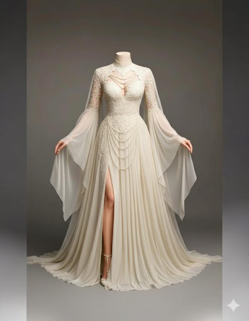 For the fantasy lover who wants to feel like they are in an ACOTAR wedding with their fae prince, this dress might be the perfect fit. Featuring romantic sleeves, beading and a dramatic slit this dress screams “otherworldly princess.” This version is in white, but the seller has listings with lots of other colors too.