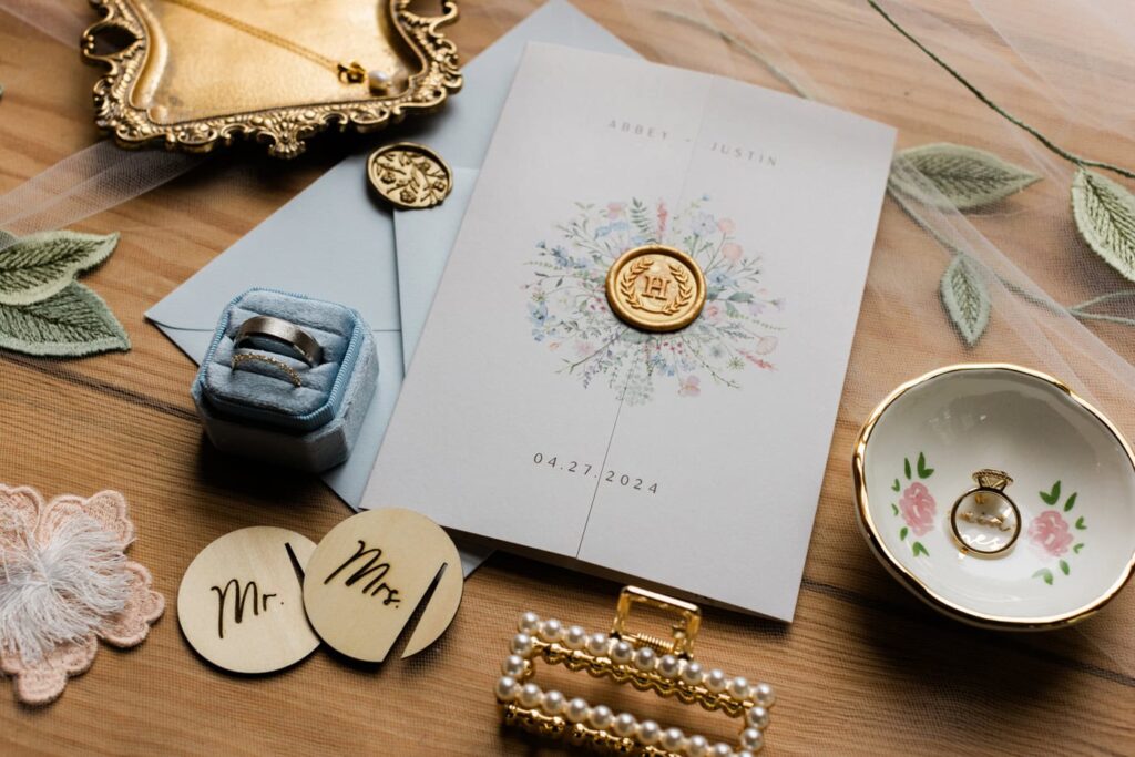 Wax seals, ribbon, or gauze in your wedding colors can bring cohesion to a flat lay.
