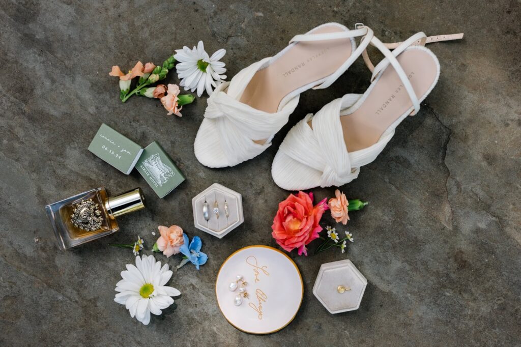 Pro tip: Gather everything you want photographed in a plastic storage bin. That way you aren’t leaving hair and makeup trying to figure out where your shoes got to. You can just hand your photographer the bin and they can start working on your details!